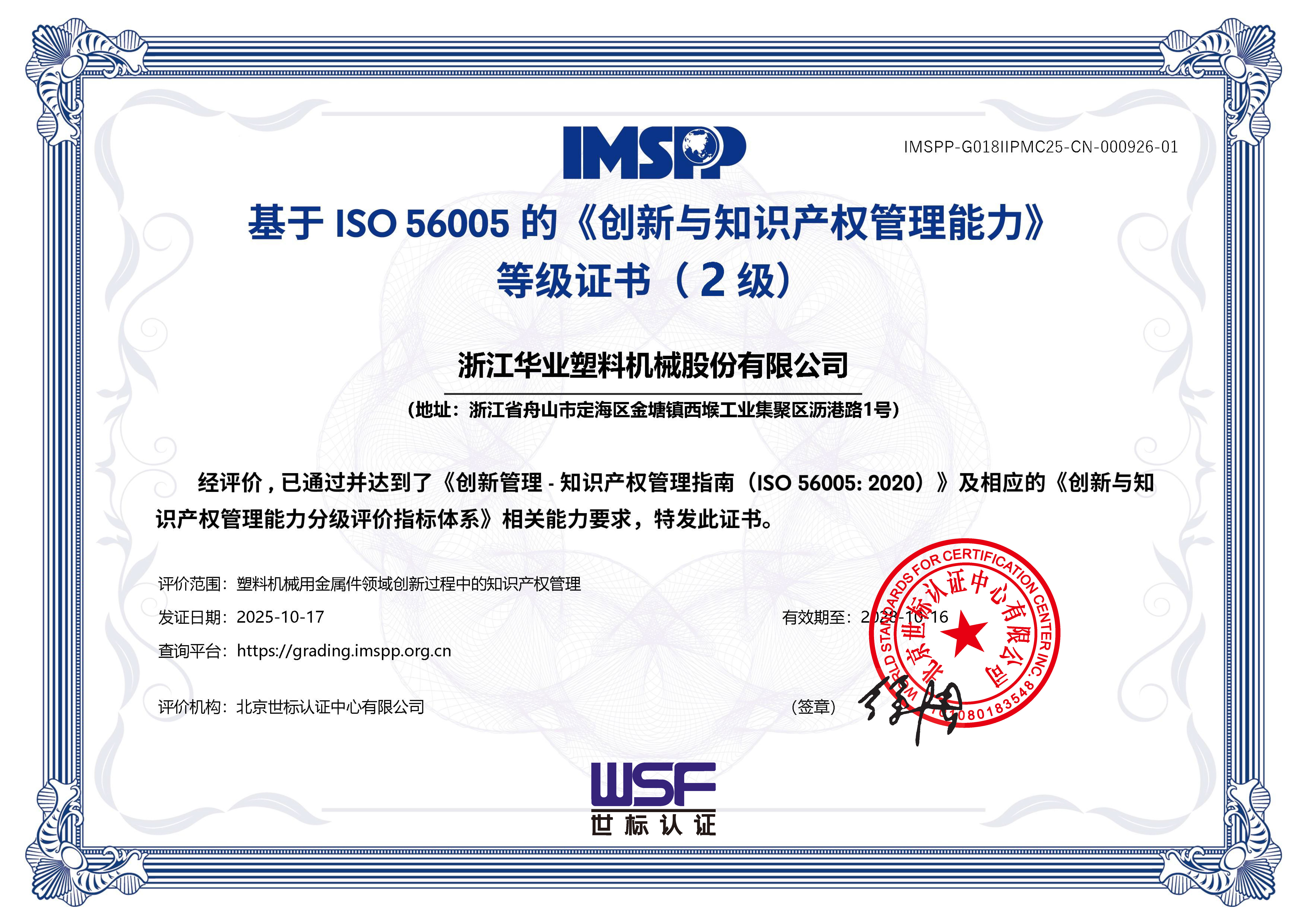 近日,浙江華業(yè)塑料機械股份有限公司(SZ.301616)榮獲ISO 56005的《創(chuàng)新與知識產(chǎn)權(quán)管理能力》等級證書…